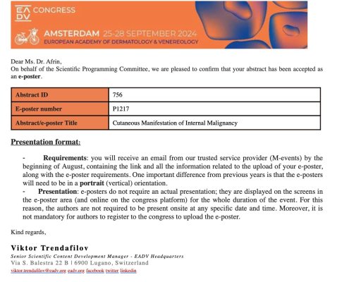 ডাঃ সাজিয়া আফরিনের গবেষণা ইউরোপীয় একাডেমি অফ ডার্মাটোলজি কর্তৃক গৃহীত হয়েছে।