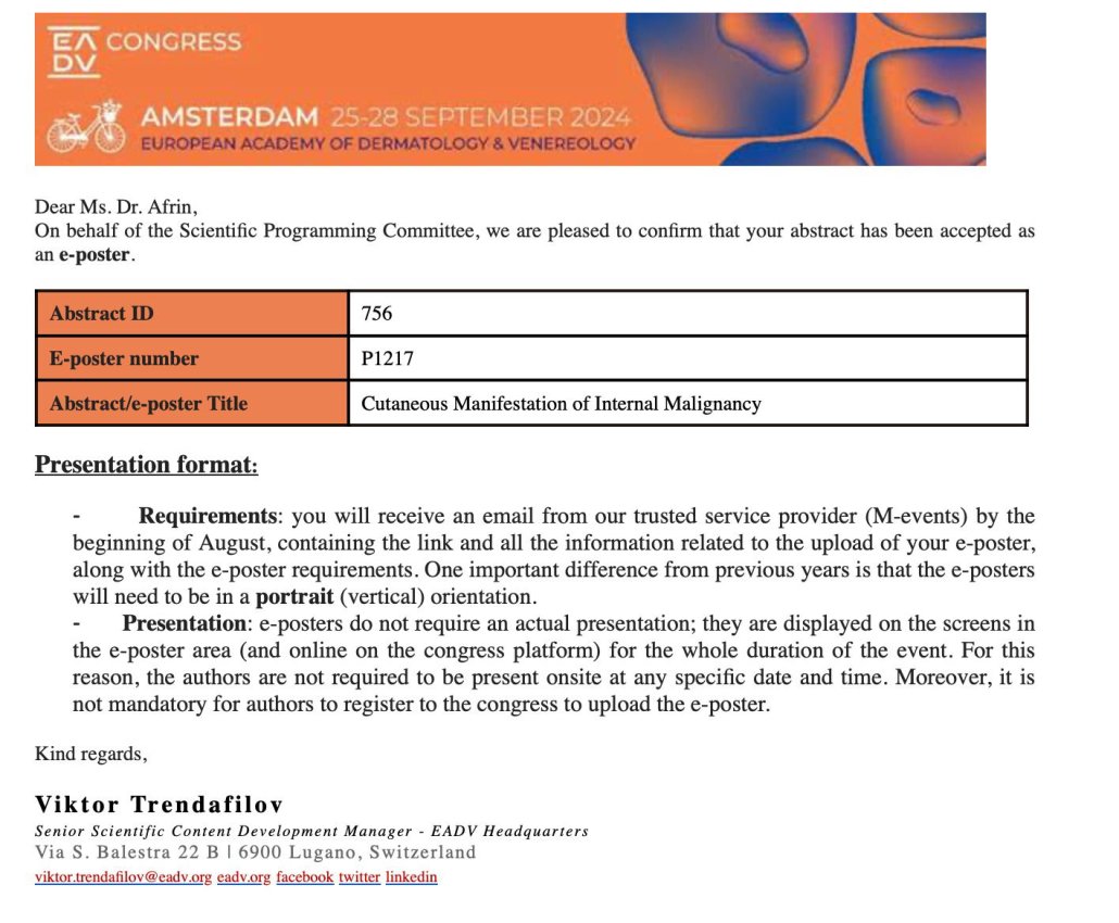 Thrilled to announce that the abstract of Dr. Sazia Afrin’s research has been accepted by the European Academy of Dermatology and Venereology!